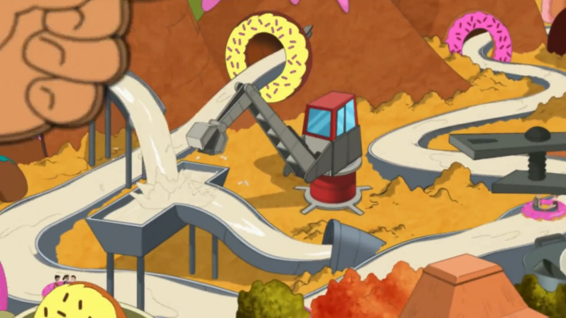 In "Fungus Among Us" and "The Phineas and Ferb Effect", Derek and his army imprisoned all the captured humans in Lard World. There was a Giant Pistachion masquerading as Lardee Boy in the sewers, and the amusement park was full of vines.