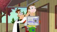 Afterwards, Doofenshmirtz applies the robot Milo head onto the Inator so it only specifically locates Milo, as it is made of Milo's DNA. When they do find Milo falling towards them, Doofenshmirtz makes the robot Milo head blow up balloons to break the fall, likely a leftover from the original version of the Shenaniganator. | |